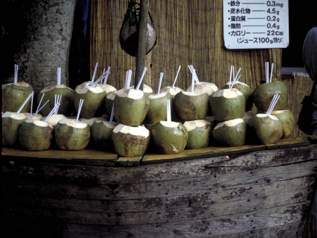 | 沖縄はあたたかいのでたくさんくだものができます。これはヤシの実を売っているところです。