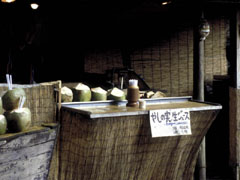 | 沖縄はあたたかいのでたくさんくだものができます。これはヤシの実を売っているところです。