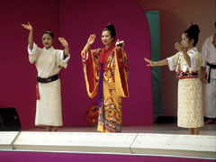 琉球舞踊の様子です。踊りには宮廷舞踊の「古典舞踊」と庶民の生活を描いた「雑踊り」,最近できた「創作舞踊」,沖縄の土地の様子をあらわした「民俗舞踊」の4つがあります。