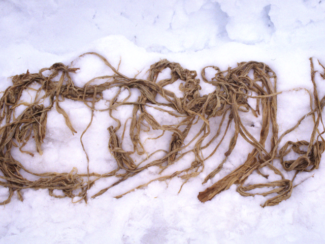 | 山中和紙は、河合村でつくられている和紙です。写真は、和紙の原料となる楮(こうぞ)を蒸して皮をむき、雪の上で晒しているところです。
