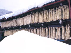 | 山中和紙は、河合村でつくられている和紙です。写真は、和紙の原料となる楮(こうぞ)を蒸して皮をむき、雪の上で晒したものを、自然漂白しているところです。
