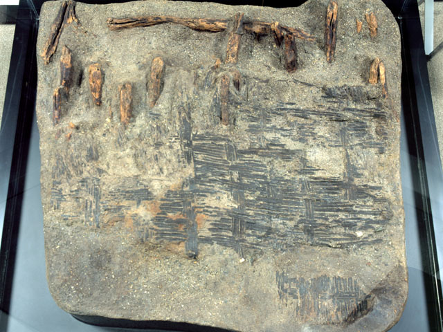 (財)岐阜県文化財保護センター設立54年のあゆみ (顔戸南遺跡出土の網代 展示ブース) 網代とは、木や竹などを縦横に編んだものであり、現在の土嚢の基本となるものである。 古墳時代の初めには、人々はこうした網代や木杭を張ることによって堤防を築き、利水をしながら米作りに励んでいた。 2001年1月9日・10日撮影。 |