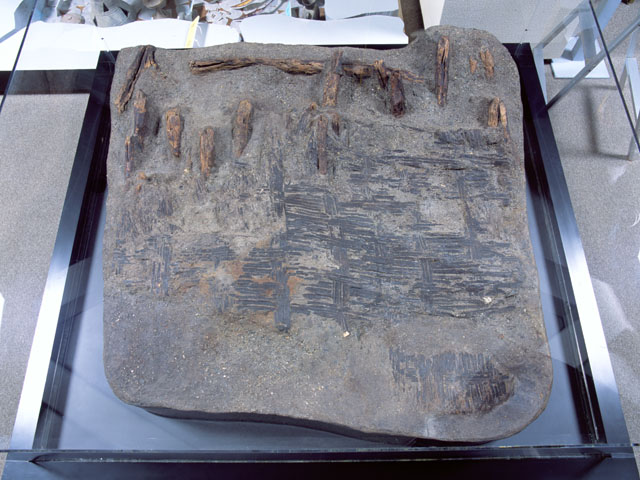 (財)岐阜県文化財保護センター設立55年のあゆみ (顔戸南遺跡出土の網代 展示ブース) 網代とは、木や竹などを縦横に編んだものであり、現在の土嚢の基本となるものである。 古墳時代の初めには、人々はこうした網代や木杭を張ることによって堤防を築き、利水をしながら米作りに励んでいた。 2001年1月9日・10日撮影。 |