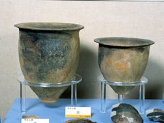 (財)岐阜県文化財保護センター設立61年のあゆみ (弥生時代のはじまり<弥生時代前期> 展示ブース) 弥生前期の土器は、写真のように形や模様などがシンプルなものとなっている。 2001年1月9日・10日撮影。 |