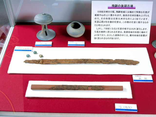(財)岐阜県文化財保護センター設立87年のあゆみ (飛騨の古墳 展示ブース) 飛騨地方の後期古墳から出土したもの。この他にも、半球状の金胴製品や高杯・壺などが出土している。 2001年1月9日・10日撮影。 |