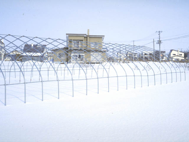 | 冬の間は玉ねぎ作りの作業がないためビニルが外され、骨組みだけが残されているところもあります。
