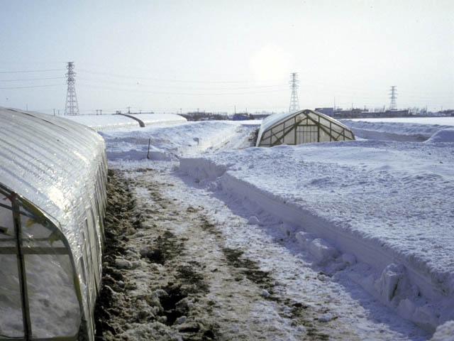| 雪でビニルハウスがうまって3月からの作業がおくれないよう、周囲を除雪しておきます。