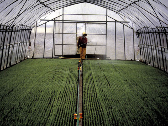 | ビニルハウス内は雨が降らないので、人間の手によって水が与えられます。