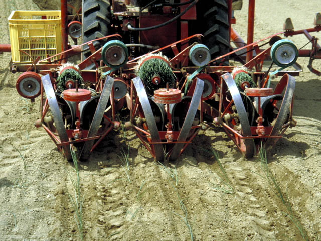 | 機械の中に送りこまれた苗は1本1本植えられていきます。