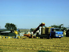 | コンテナに積まれた玉ねぎは選別機にかけられ、大きさごとに(LL,L,S,SS)に分けられます。