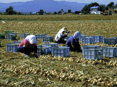 | 掘り出された玉ねぎは畑の中で見たり手に持ったりしながら、人の手で大きさが選別され箱に入れられます。