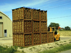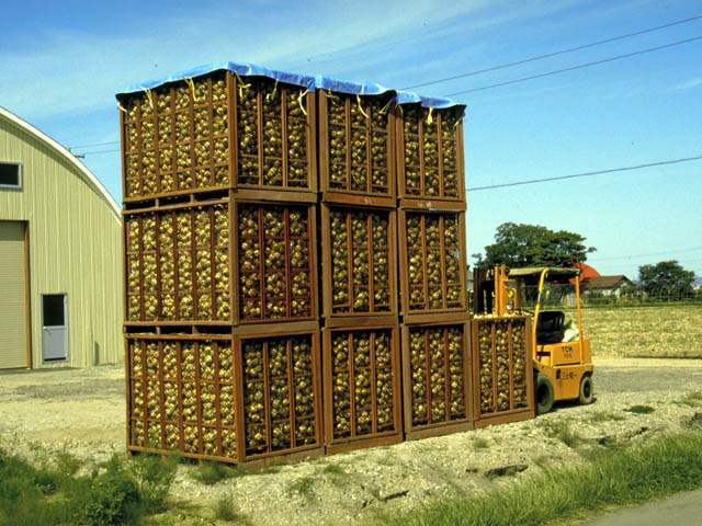| コンテナを積み重ねて乾燥させることもあります。コンテナは風通しがよく作られていて、玉ねぎを十分に乾燥させると品質が保たれます。