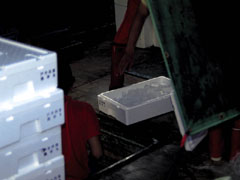 | 一人が船倉に入って氷を詰め、別の人が箱を積み上げていくというように何人かで手分けをして能率よく作業を行います。一度に約500キログラムの氷を運びます。