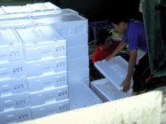 | 1箱ずつイカが入る隙間だけを残して、氷を詰めていきます。漁に出る前に200箱ほど用意します。子供たちも家族の仕事を手伝います。