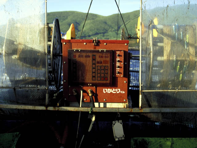 | イカを自動的に釣り上げる機械です。「いかとりくん」という名前が見えます。コンピューターが組み込まれていて、決められた深さまで、針がついたワイヤーを下ろしたり巻き上げたりをくり返します。深さや巻き上げる速さを自由に調節できます。