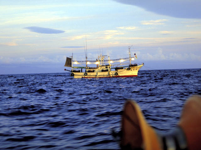 | 漁師さんは仲間の船と無線で連絡を取り合いながら船を操縦し、イカの群れを探します。