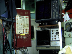 | 船を操縦する操舵室の中にある漁をするためのハイテク機械です。左側の赤い機械がイカつり機をコントロールするための機械です。中央のテレビのような2台の機械は魚群探知機です。