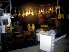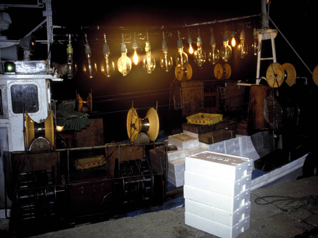 | 漁を終え、明け方港に帰ってきた漁船です。イカと氷が入った魚箱が船から下ろされます。軽トラックやリヤカーで近くの市場へ運ばれて競りにかけられます。大漁の時には500箱以上にもなります。