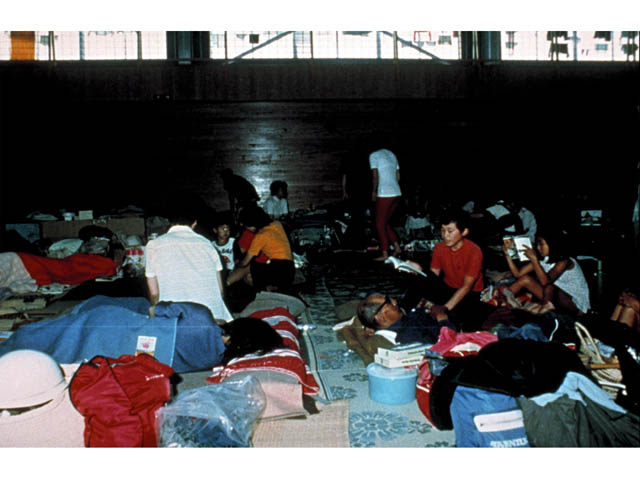 | 8月8日の大噴火は温泉街に軽石を降らせ、住民や観光客は恐怖の一夜を過ごしました。翌日の早朝非難命令が出され、2,500人の人々が非難しました。このような体育館での生活は、およそ1か月も続きました。