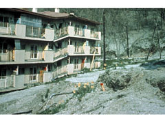 | 噴火からおよそ1カ月経過した頃より、地殻変動は北麓にも及んできました。木の実団地にあるマンションの真下に発達した垂直の断層(落差1.5m)により、建物の破壊が進行している状況です。