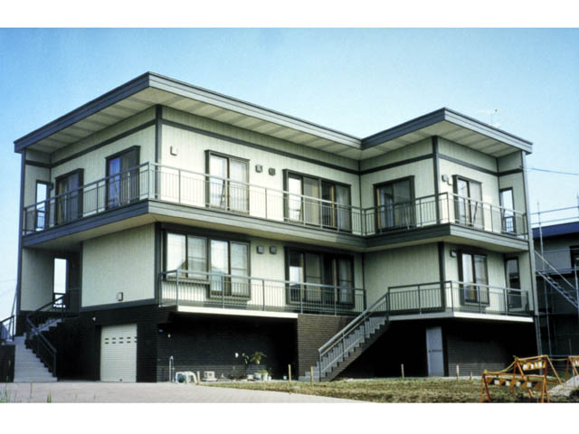 | 北海道の家は雪に備えて、基礎部分が高く作られています。そのため玄関が高い位置にあり、玄関前に階段がある家が多くみられます。この家は屋根が平たく落雪が少ないようにできています。屋根に積もった雪の重さに耐えられる構造になっています。