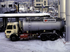 | 原料は袋に詰められて運ばれてくる他に、フラワーローリーといわれている特別な車で工場前の4本のタンク(貯ぞうバランク)に搬入されます。この工場では、良質の海外産の小麦を主に、道内産の小麦も使用しています。小樽の製粉工場で厳しいチェックを受けて出荷されます。
