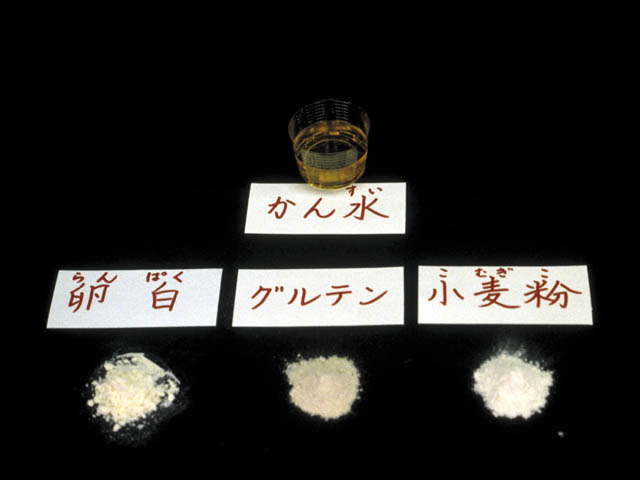 | 小麦は表皮・胚乳・胚芽の3つの部分からなっています。グルテンは小麦粉の淡白質のことをいい、弾力性と粘着性を持っています。練り水は地下200mから汲み上げた良質の地下水にアルカリ分、食塩、ビタミンB2などを加えて作った「かん水」です。