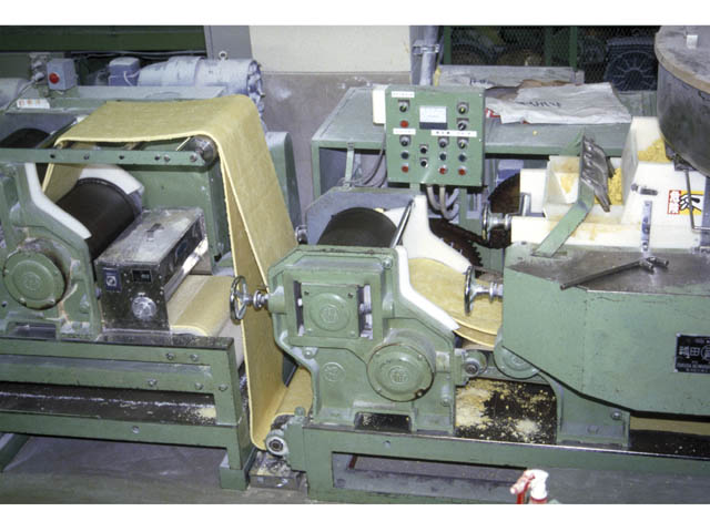 | 原料をこね合わせると麺塊ができます。この麺塊は「複合機」と呼ばれる機械で帯状にされます。これが麺帯です。