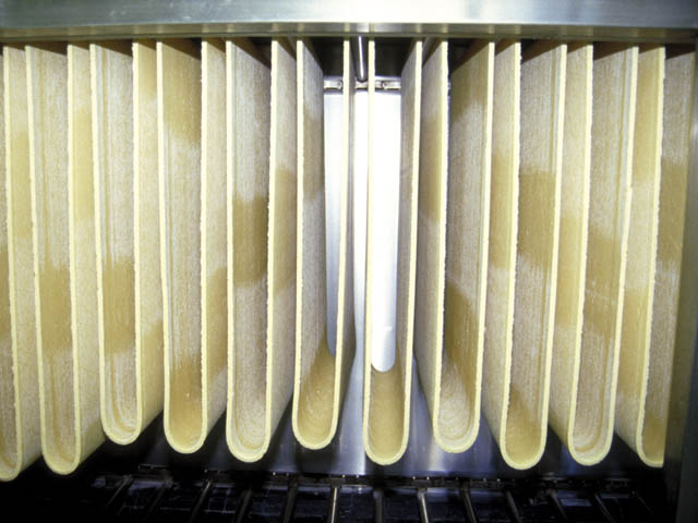 | 伸ばされた麺帯には歯ごたえがあって、さらに良い味になるように適度な温度、湿度を与えます(時間は約30分)。湿度を保ったり、紫外線による麺の変化を防ぐために、プラスチックのカバーで覆っています。
