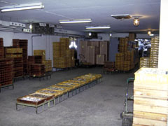 | 袋詰めや木箱に詰められたラーメンは大きな「冷蔵庫」に運ばれ冷やされます。冷蔵庫は平均4〜5℃に保たれています。この中は、送り先ごとに場所が決められています。