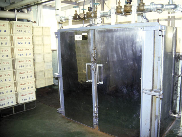| 学校給食用に茹でられた麺は品質を保つために蒸気殺菌庫へ運ばれます。学校で食べられるその日の朝に茹でられます。
