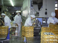 | 食品工場は衛生が第一です。白い作業服を着て白い帽子をかぶって仕事をします。いつも消毒して清潔な服装に心掛けて工場に入ります。