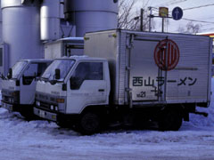 | 冷蔵庫で冷やされたラーメンは、届け先や数を確めてトラックに積まれます。このトラックは「保冷庫」と呼ばれ、ラーメンなどの製品を一定の温度に保ちながら運ぶことができます。ラーメンは、主として市内のラーメン専門店やデパート、スーパーマーケット、食堂へ運ばれます。