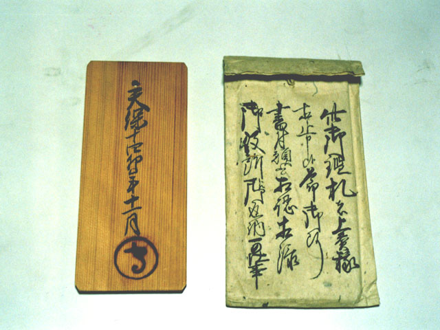 飛州大野郡荻町村 木製の札で裏に役所の焼印がある。 焔硝製造稼人に出された鑑札で一種の株。(裏面) |