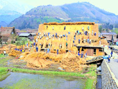 | 周囲を固めた後は、屋根の厚みをつけているフキガヤに入ります。この作業には結(ゆい)の協力が不可欠です。