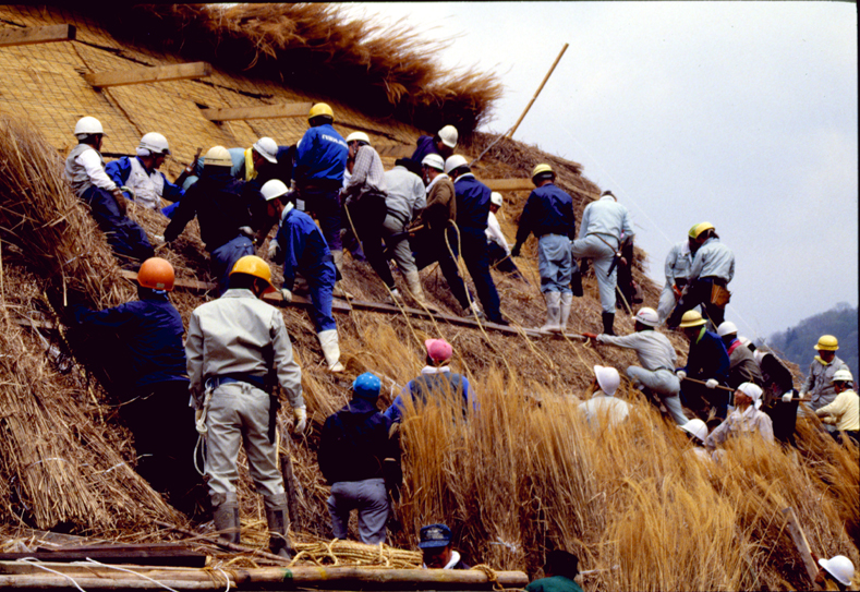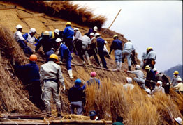 | カイドウを足場とし、置いた茅をツキアゲで押し上げて、平らな面に整えていきます。