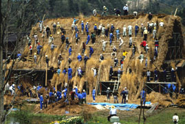 結(ゆい)によって集まった人々の連携によって次々と茅が葺かれていく様子が分かります。