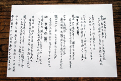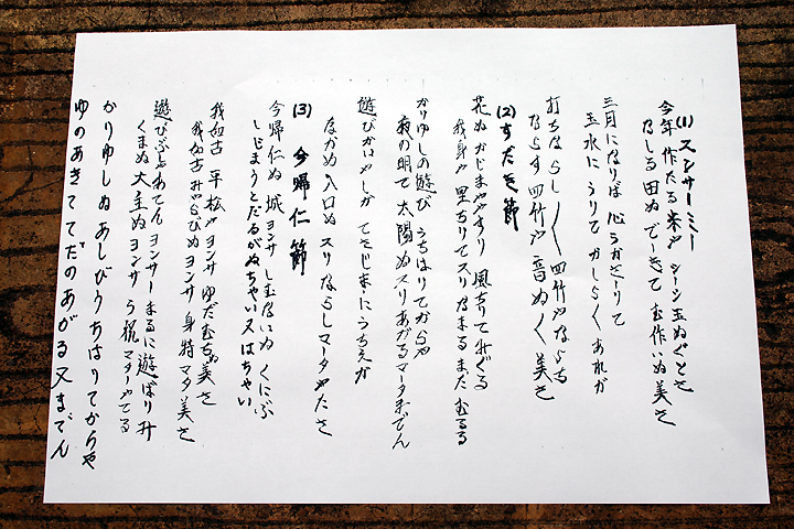 今年作たる米やシーシ玉ぬぐとさ なしる田ぬでーきてむ作いぬ美さ 三月になりば心うかさしりて 玉水にうりてかしらかしらあれが 打ちならし打ちならし四竹やならち ならす四竹や音ぬ音ぬ美さ (2)すだき節 花ぬかじまややすり風ちりてみぐる 我身や里ちりてスりなまるまだむるる かりゆしの遊びうちはりてからや 夜の明て太陽ぬスりあがるマータまでん 遊びかはやしがてさじまにうちえが なかぬ入口ぬスリならしマータやたさ (3)今帰仁節 今帰仁ぬ城ヨンサしむないぬくにぶ しじまうとだるがぬちゃいヌはちゃい 我如古平松やヨンサゆだむちぬ美さ 我如古みやらびぬヨンサ身特マタ美さ 遊びぶしゃあてんヨンサーまるに遊ばりみ くまぬ大主ぬヨンサら祝マターやてる かりゆしぬあしびうちはりてからや ゆのあきててだのあがる又までん |