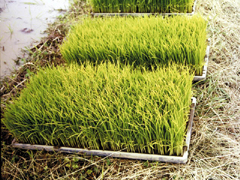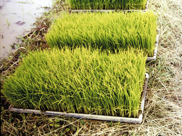 | 苗床。機械を使って田植えができるように一定の箱の大きさで苗を育てる。