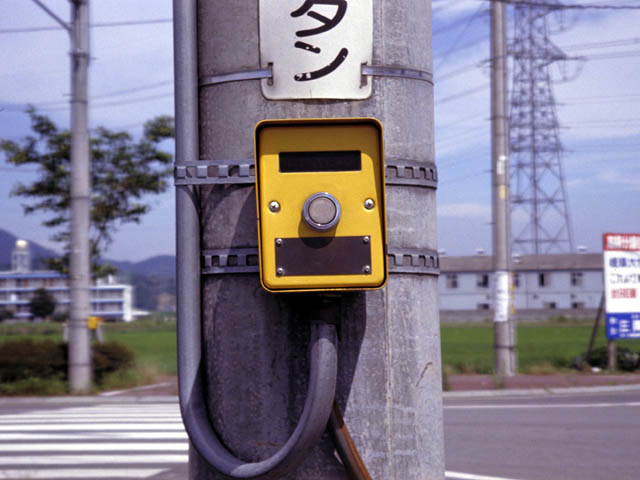 | 押しボタン式信号機。歩行者が横断する時は,「押しボタン」を押し,信号が青のなってから横断をする。