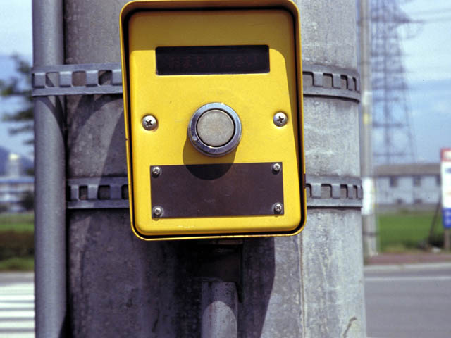 | 押しボタン式信号機。歩行者が横断する時は,「押しボタン」を押し,信号が青のなってから横断をする。