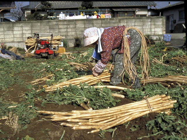 | 守口大根作りの様子。抜き取られた大根は、丁寧に束ねられ出荷される。