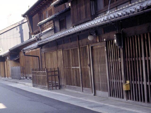 | 長良川南詰めの湊町一帯に残っている、奥行きが深く、格子戸に黒塀の家並み