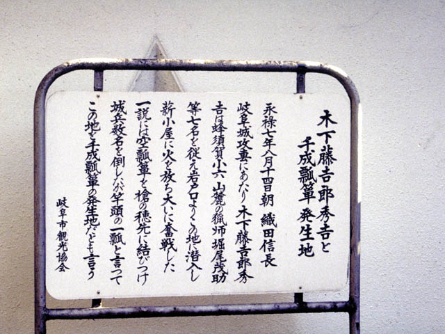 | 金華山山麓にある木下藤吉郎秀吉と千成瓢箪発生地の看板