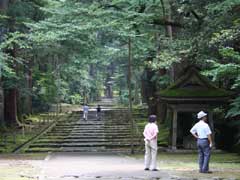 参道です。 苔むす石畳の参道に沿って、杉やケヤキなどの巨木が生い茂っています。 |