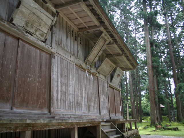 拝殿です。 天平寺院の趣の残る拝殿は江戸の幕末の建物であり、その山号額は江戸時代の元禄年間、天真親王の筆で「中宮平泉寺」と書かれています。 拝殿にかかげられた4つの額をよくみることができます。 拝殿内には20数点の絵馬がかかげられており、そのうち16点が勝山市指定文化財となっています。 越前家松平一族の奉納絵馬が特に多くあります。 |