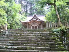 本社の石段と石垣です。 本社がおかれている高台の石垣は、室町末期弘治年間に平泉寺六千坊が競争し作ったといわれ、豪壮です。 この巨石は宝光院や玉泉坊が運んだものといわれています。 |