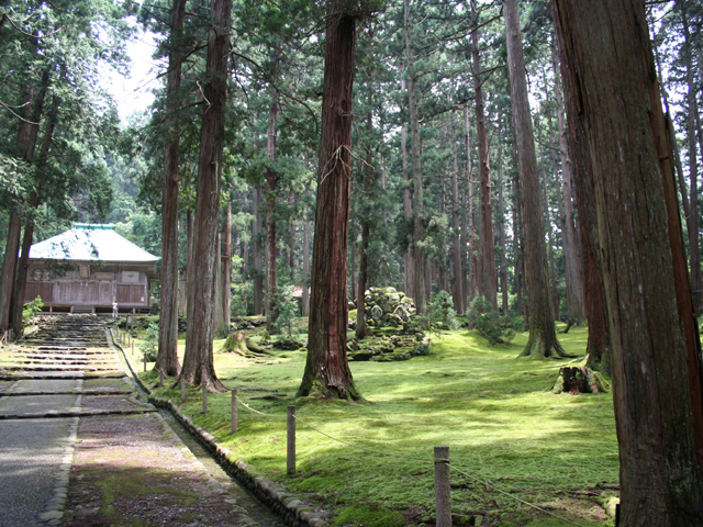 境内の杉林です。 境内は石畳の参道を除いて一面苔で覆われており、杉などの巨木が影を落としています。 |