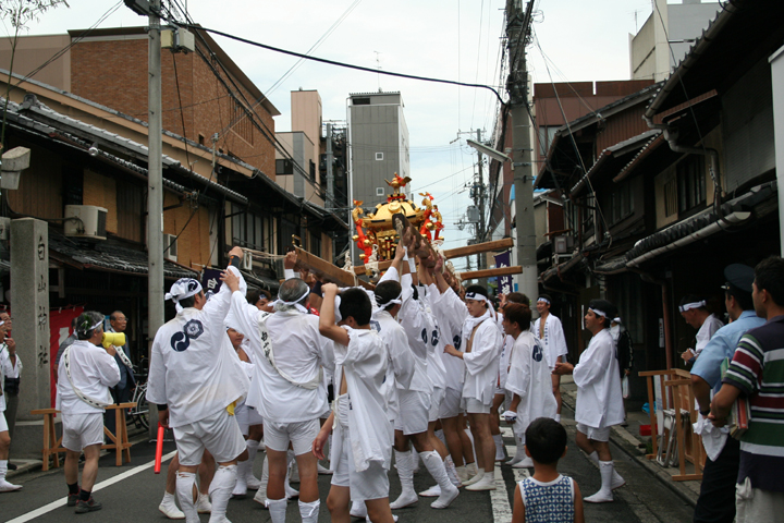 神輿渡御・区内巡行を終え、白山神社前にて神輿を大きく上下に揺らして祭りの締めくくりとします。 平安末期1177年(治承元年)加賀白山社から都に神輿振り(神輿を奉じての強訴)にやってきて、叶わぬままに打ち捨てられた3基の神輿のうちの1基をお祀りしたことが、この白山神社の起りとなっています。 毎年9月19日(例祭)に近い土・日曜に白山神社秋の大祭を執り行ない、年に一度の神輿渡御・区内巡行をします。 |