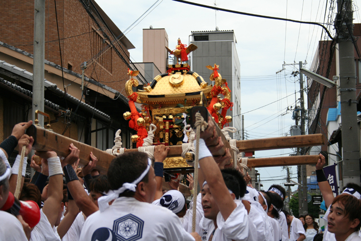 神輿渡御・区内巡行を終え、白山神社前にて神輿を大きく上下に揺らして祭りの締めくくりとします。 平安末期1177年(治承元年)加賀白山社から都に神輿振り(神輿を奉じての強訴)にやってきて、叶わぬままに打ち捨てられた3基の神輿のうちの1基をお祀りしたことが、この白山神社の起りとなっています。 毎年9月19日(例祭)に近い土・日曜に白山神社秋の大祭を執り行ない、年に一度の神輿渡御 区内巡行をします。 |